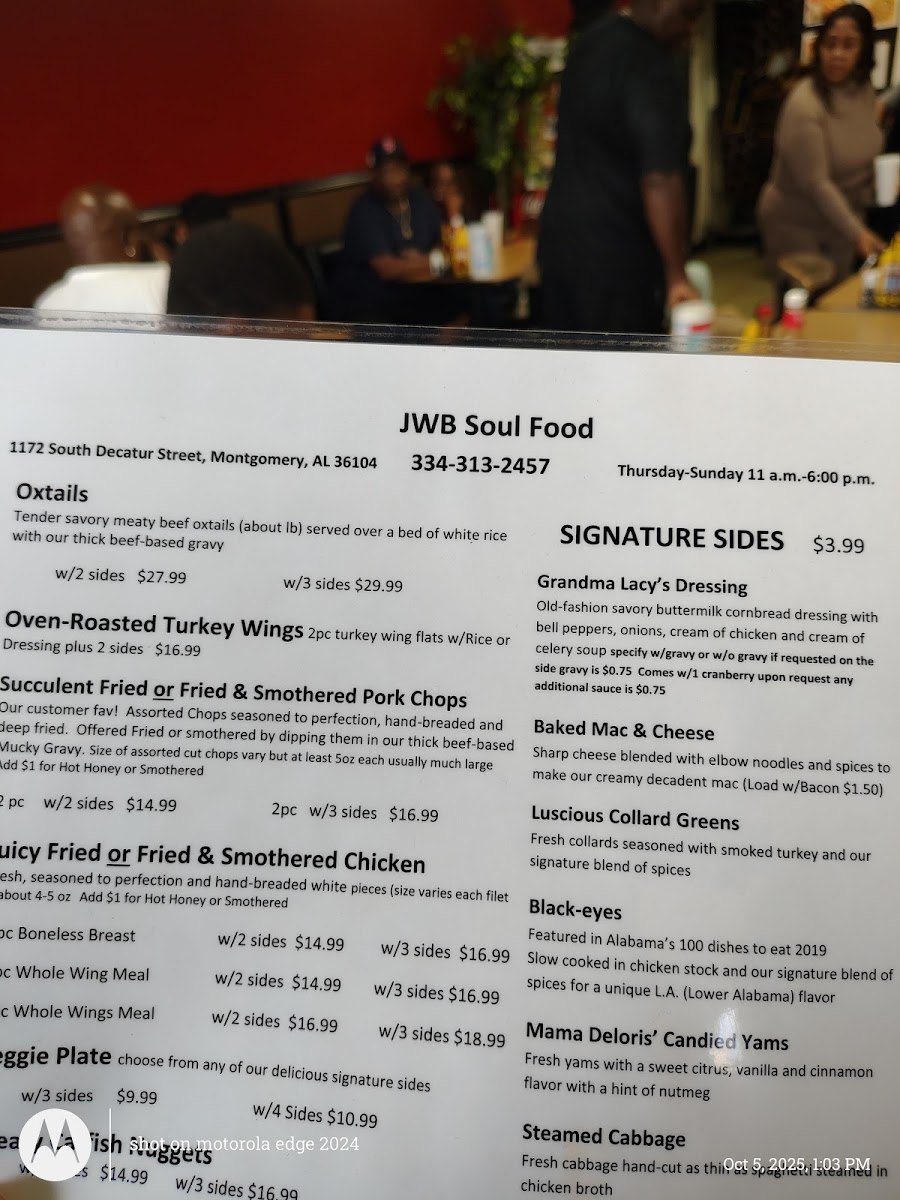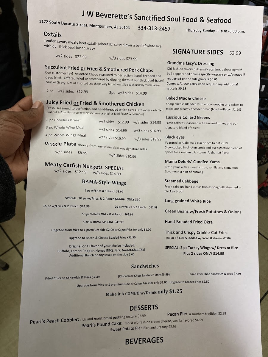If you're craving comfort food with a touch of Southern soul, look no further than J.W. Beverette's Soul Food Menu. Located at 1172 S Decatur St, Montgomery, AL, this spot serves up classic dishes that bring the warmth and heart of home cooking straight to your table. Whether you're in the mood for perfectly fried catfish, tender oxtails, or the juiciest fried chicken, there's something here for everyone. The side dishes, from buttery mashed potatoes to golden cornbread, are just as comforting and flavorful as the mains. And don’t even get us started on the collard greens-they’re the perfect balance of tender and tasty, with just the right amount of seasoning. Every meal is a reminder of why soul food holds such a special place in the heart of Southern cuisine. So, gather your loved ones, come hungry, and dive into a menu that feels like a big, warm hug.